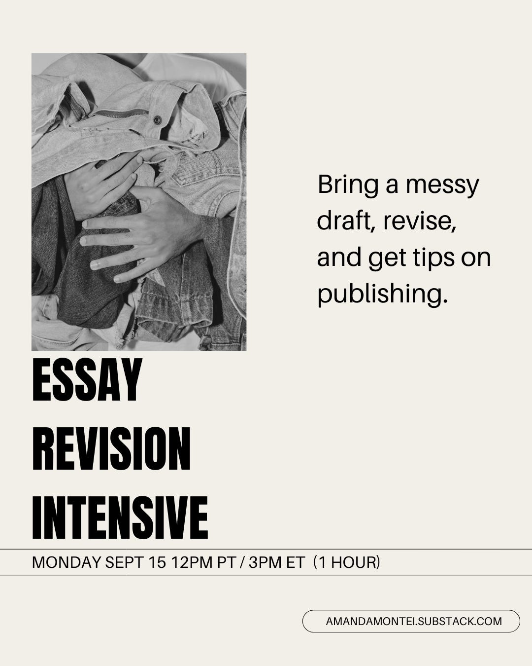 For regular paid subscribers, I will also be offering a 1-day Essay Revision Intensive class to ALL paid subscribers next week, on Monday Sept 15 at 12pm PT/3pm ET. More info below. If you want to attend just this class, all you have to do is upgrade to a regular paid subscription before Monday.